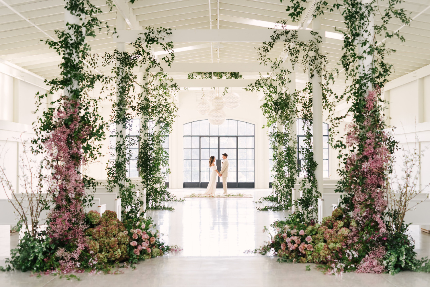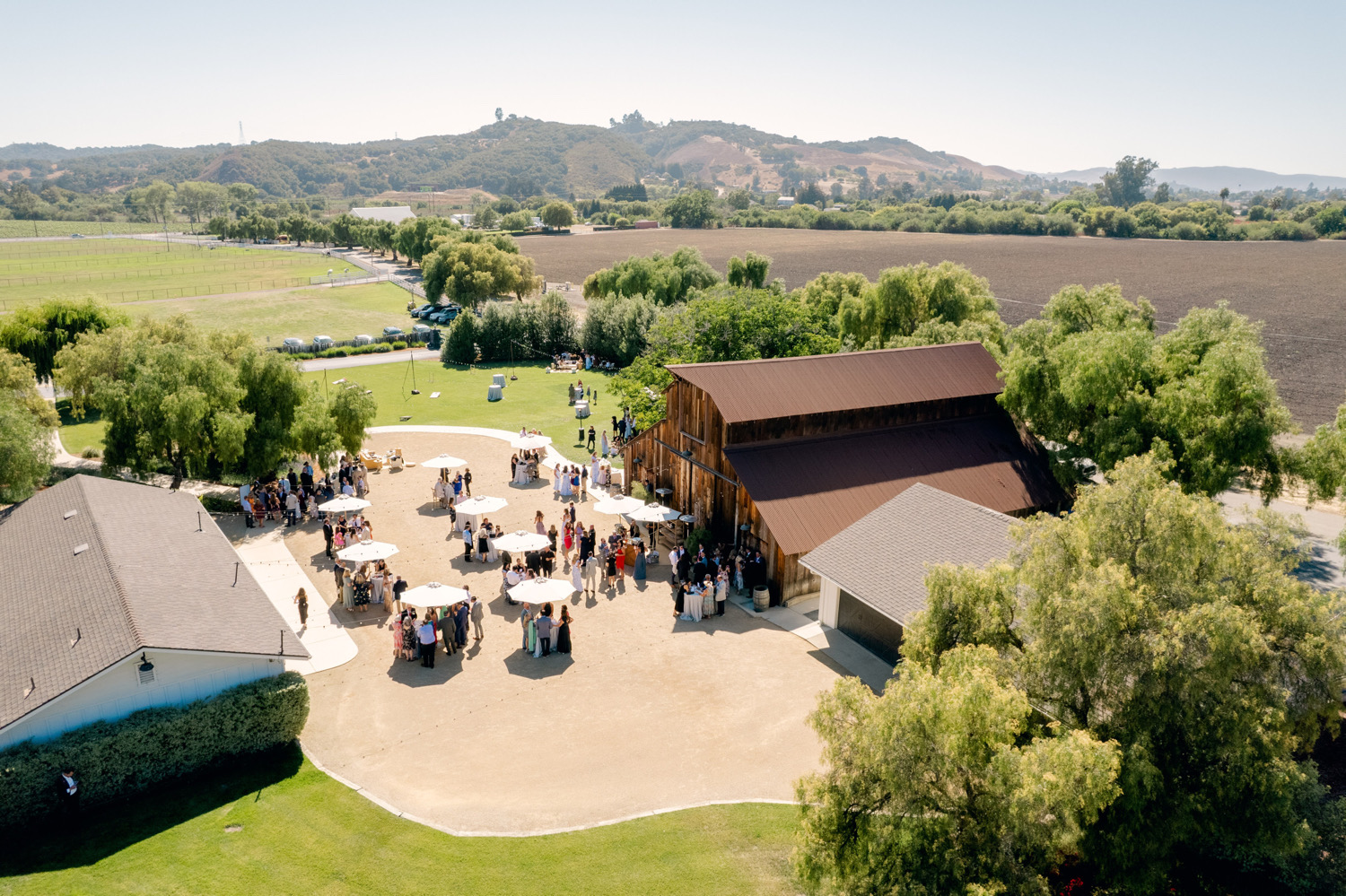 This picturesque ranch and vineyard located in the heart of Edna Valley offers a rustic-yet-elegant setting for a wine country destination wedding. Just minutes from the San Luis Obispo County Regional Airport and the vibrant nightlife of downtown SLO, this impressive venue features multiple event spaces that cater to larger events – a grand barn made of beautiful reclaimed wood with an onsite kitchen, newly renovated all-white stables with many amenities, in addition to well-manicured lawns, crushed granite and concrete areas for multiple ceremony and reception options. Guests can also enjoy a tranquil pond surrounded by romantic willows, outdoor terraces with endless views of the surrounding vineyards, lush gardens, an outdoor heated pool, jacuzzi, fire pit ring and BBQ area. The venue offers onsite accommodations in multiple luxury homes that sleep up to 26 guests on site. Each home boasts elegant design elements with modern amenities and gorgeous views for rehearsal dinners, welcome parties and brunches, making it a perfect choice for a memorable weekend celebration. Avenue Twelve’s wedding rentals complement the venue’s natural beauty, making it an ideal location to bring your wedding vision to life.